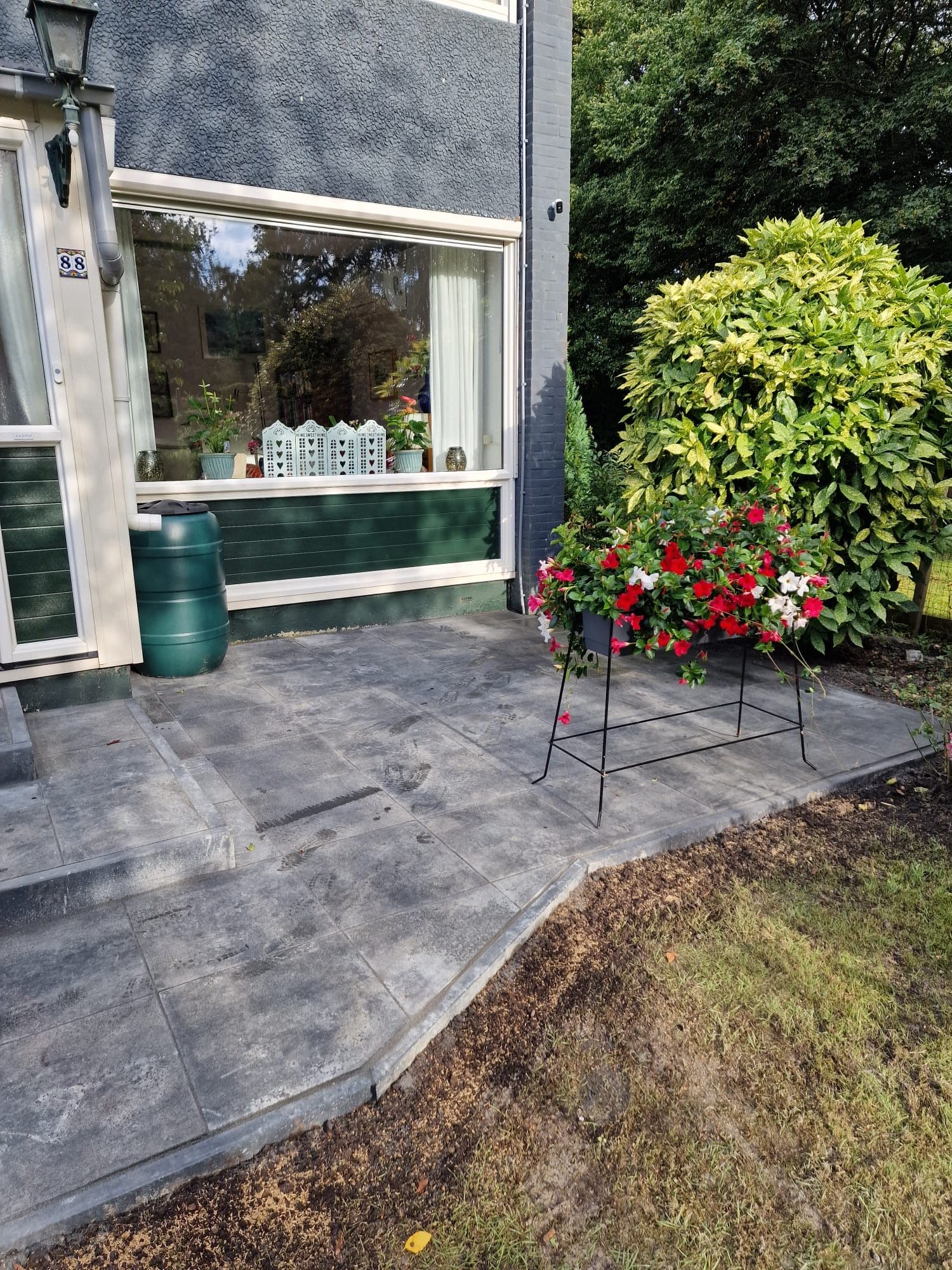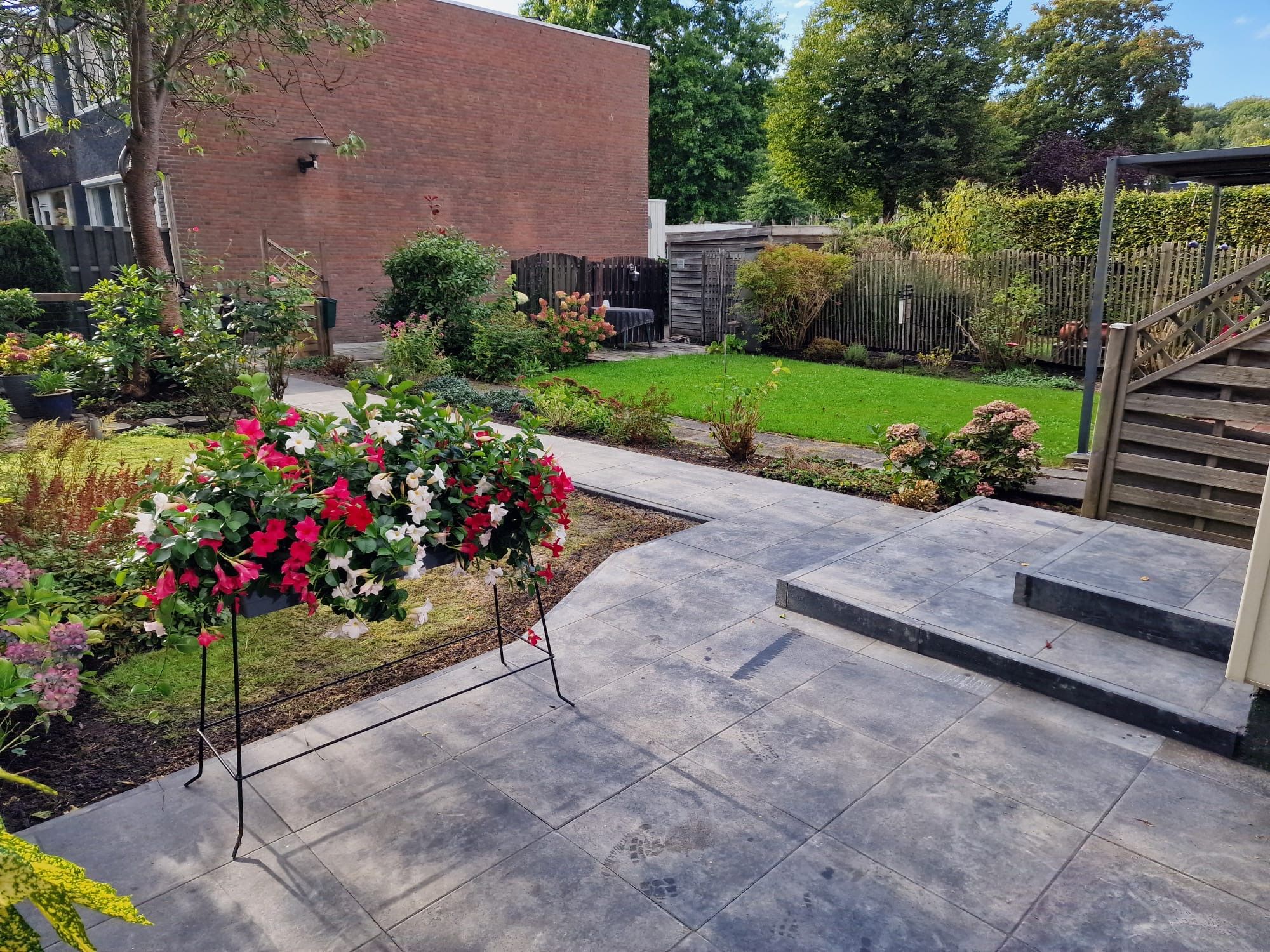 “De wensen zijn eerst van te voren besproken, er werd goed meegedacht. Er werd erg hard en secuur gewerkt, de bestrating licht er strak in met mooie tegels, precies zoals afgesproken. Alles keurig netjes afgewerkt en opgeruimd. De oude tegels en troep werd afgevoerd in een container die voor die tijd is geplaatst. Op de laatste dag kwam er als verassing een prachtig plantenrek met super mooie planten voor op het nieuwe terras, van de zwager van Ezra, de zwager heeft een eigen bloemen kwekerij. De communicatie verliep heel goed, alles in goed overleg. We zijn erg tevreden over het hele proces.”